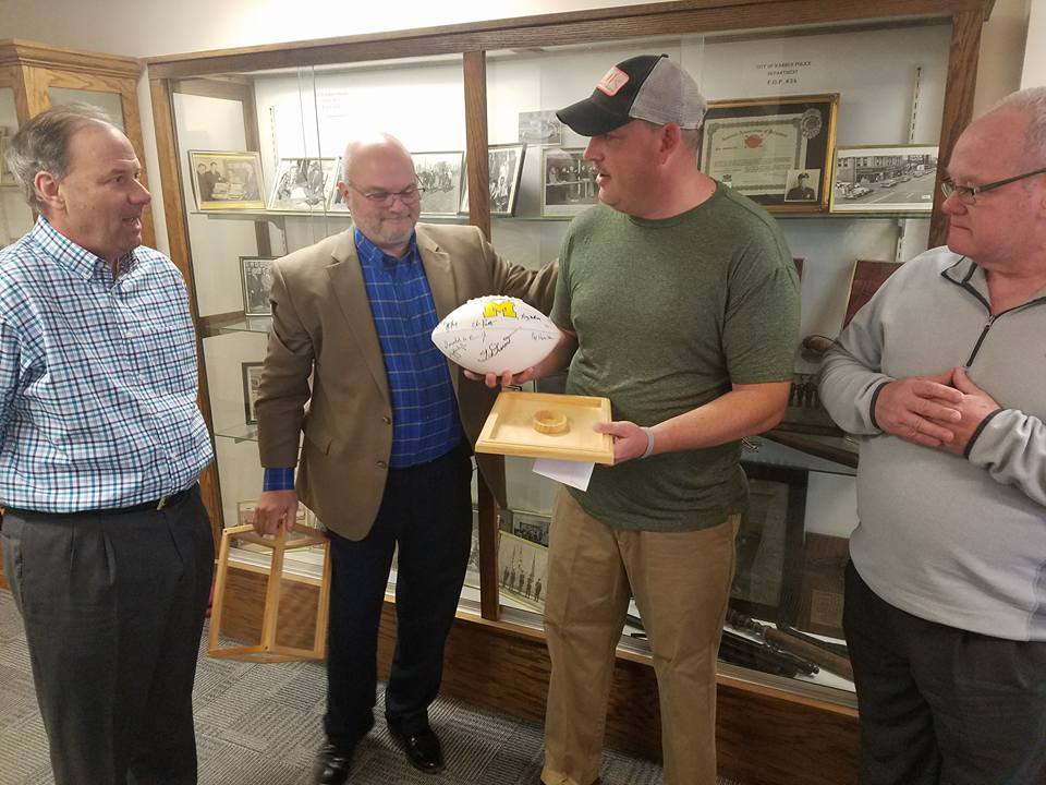 The Warren Sports Hall of Fame contributed a donation for the expenses that Warren Policeman Lance Adkins has incurred during his recent treatment for cancer. Lance being an avid Michigan football fan along with the officers of the Warren Sports Hall of Fame, from left to right, Dennis Rossi, Joe Sekula and Shawn Bryant present a Michigan football signed by the Wolverine coaching staff.